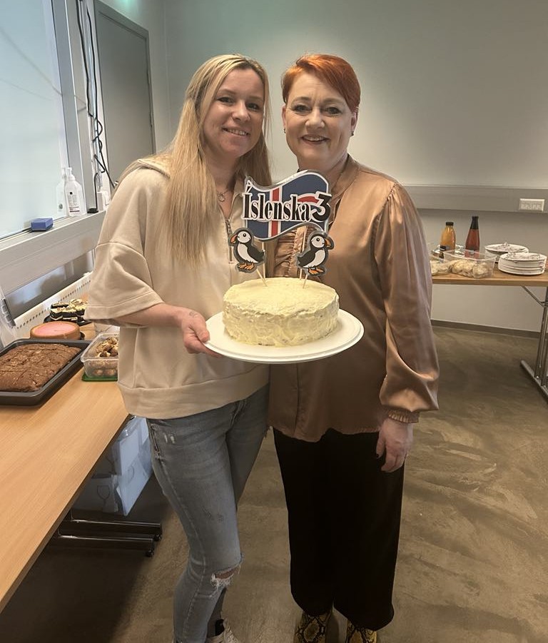 Terta í tilefni af útskrift á íslenskunámskeiði. Jóhanna Lilja er til hægri.