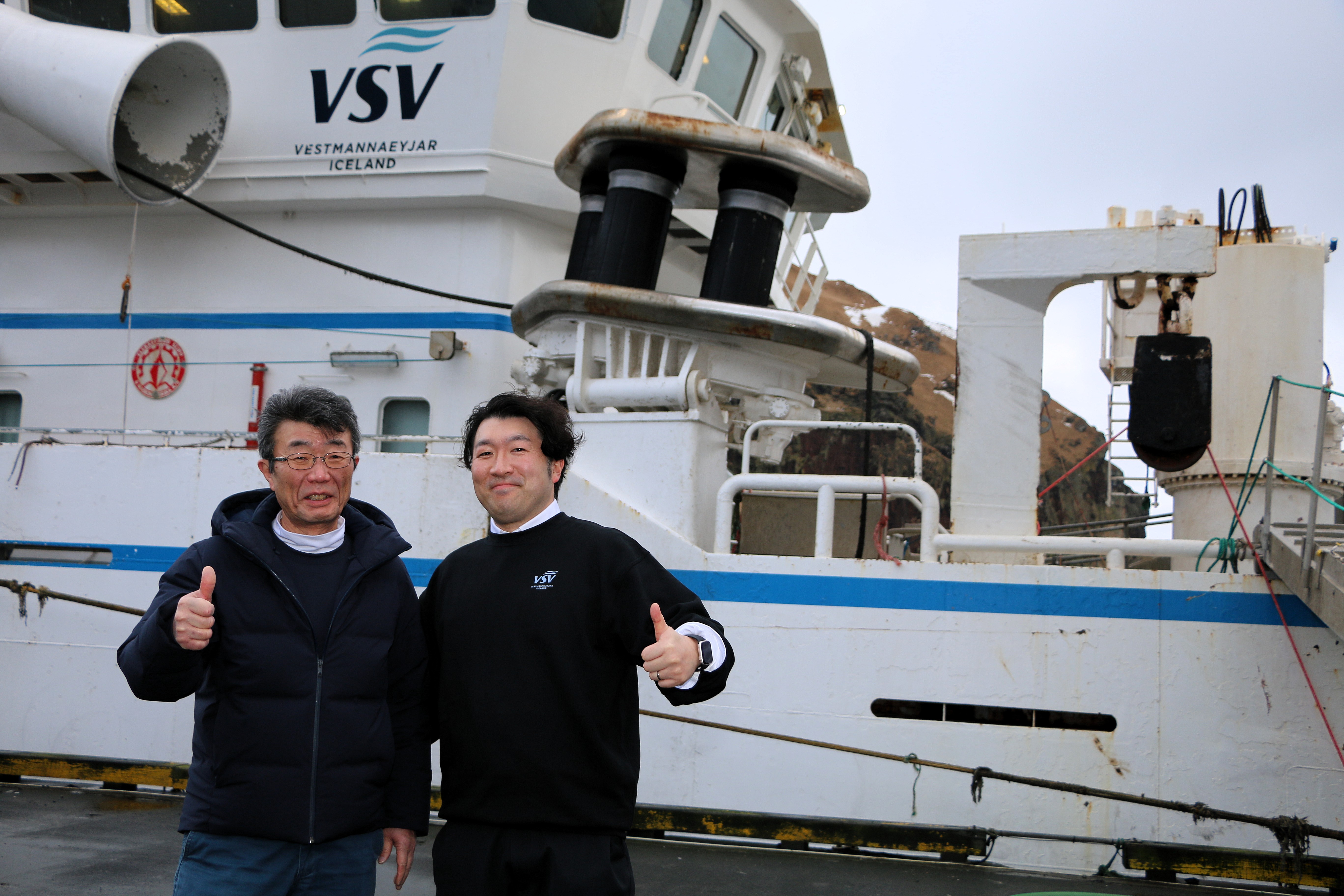 Hiroshi Okayama, sölustjóri hjá Okada Suisan og Tsuyoshi Kashima á bryggjunni í Eyjum. Sá síðarnefndi sér um innkaup á loðnu og makríl hjá Japanese Consumers’ Co-operative Union (JCCU).